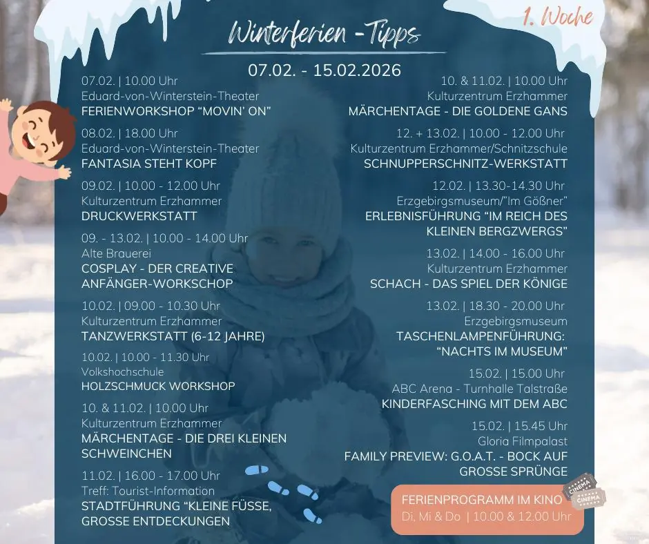 In der ersten Winterferienwoche wird es in Annaberg-Buchholz garantiert nicht langweilig! Vom 07.02. bis 15.02.2026 erwartet euch ein abwechslungsreiches Programm – kreativ, spannend und voller Bewegung.