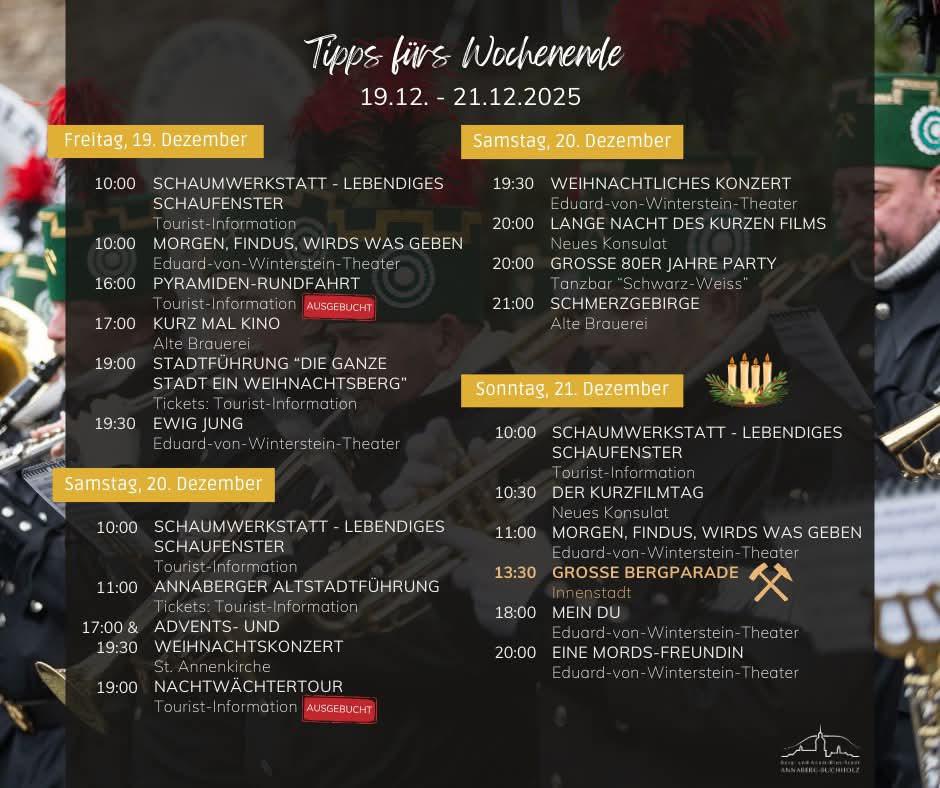 Genieรt das Wochenende in Annaberg-Buchholz und stimmt euch gemeinsam auf die letzten Tage bis Weihnachten ein.
