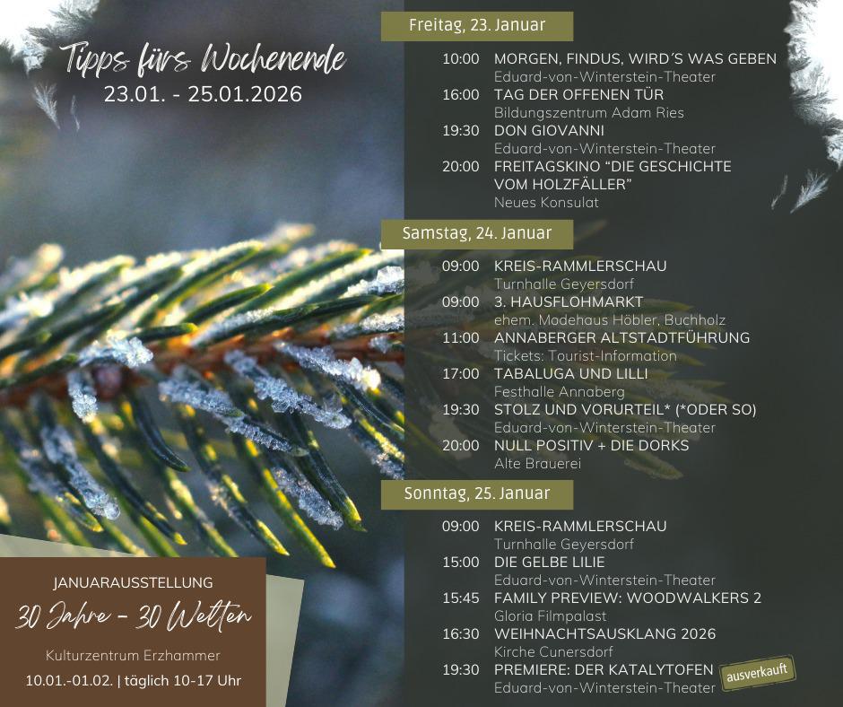 Theaterfans kommen an diesem Wochenende voll auf ihre Kosten: Besucht das *Weihnachtsmärchen „Morgen, Findus, wird’s was geben“*, die Oper in zwei Akten *„Don Giovanni“*, die *Komödie „Stolz und Vorurteil* (*oder so)“* oder die *Operette „Die gelbe Lilie“*.