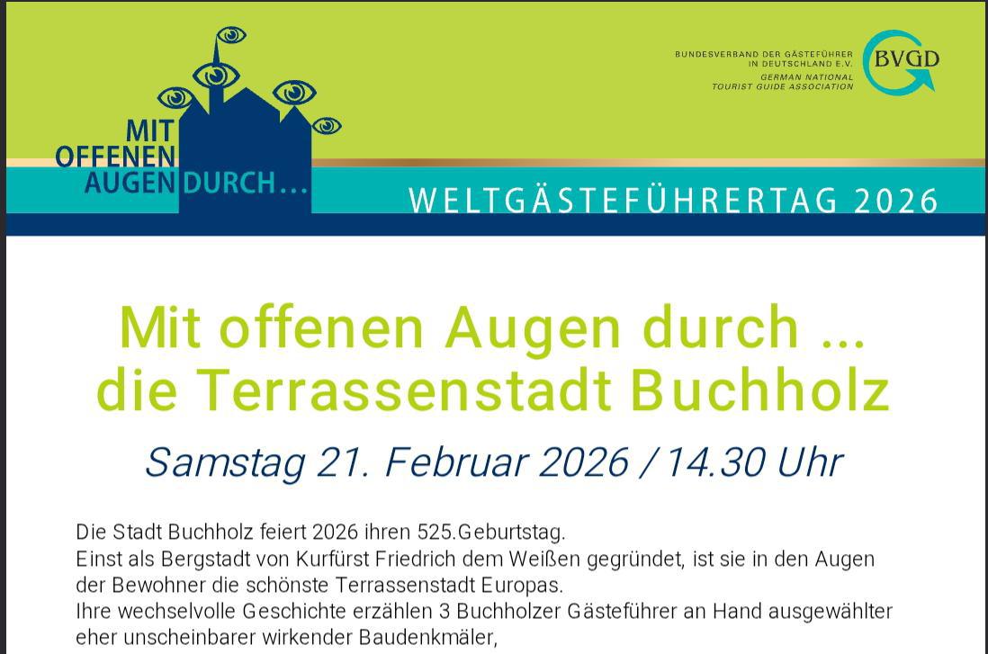 Annaberg-Buchholz, 10.02.2026 – Buchholz: Heute ein Stadtteil von Annaberg-Buchholz – feiert im Jahr 2026 seinen 525. Geburtstag. Ein Anlass, der nicht nur laut gefeiert wird, sondern auch tiefsinnig und aufmerksam, neugierig und mit viel Herz: Unter dem Titel „Mit offenen Augen durch… die Terrassenstadt Buchholz“ laden drei engagierte Buchholzer Gästeführer - Rainer Eckel, Matthias Enderlein und Joachim Reuter - anlässlich des Weltgästeführertages 2026 am 21.02.2026 von 14:30 bis 16:00 Uhr (Treffpunkt Marktplatz/Rathausplatz Buchholz) zu einer besonderen Sonderführung ein.