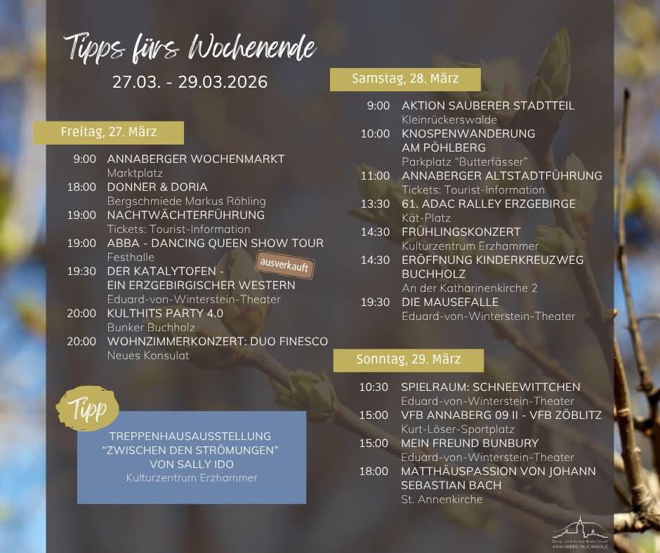 Naturfreunde können an der 𝗞𝗻𝗼𝘀𝗽𝗲𝗻𝘄𝗮𝗻𝗱𝗲𝗿𝘂𝗻𝗴 am Pöhlberg teilnehmen und erleben dabei den Frühling hautnah. Wer lieber Geschichte erkundet, schließt sich der Annaberger Altstadtführung an.